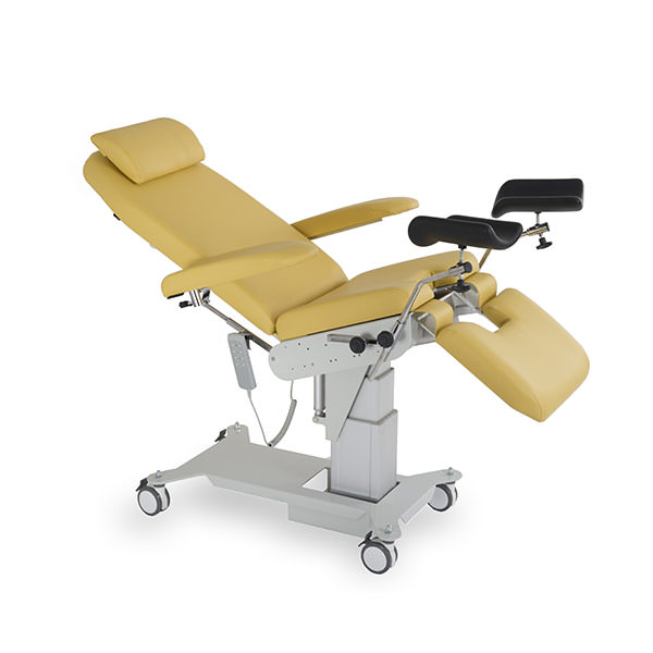 Poltrona a tre sezioni regolabile elettricamente in altezza, per terapia e visita medica, ginecologica e urologica. Pediera e schienale sono regolabili elettricamente. Il lettino è dotato di braccioli richiudibili, reggi cosce regolabili in altezza e rotazione e vaschetta estraibile in acciaio inox.